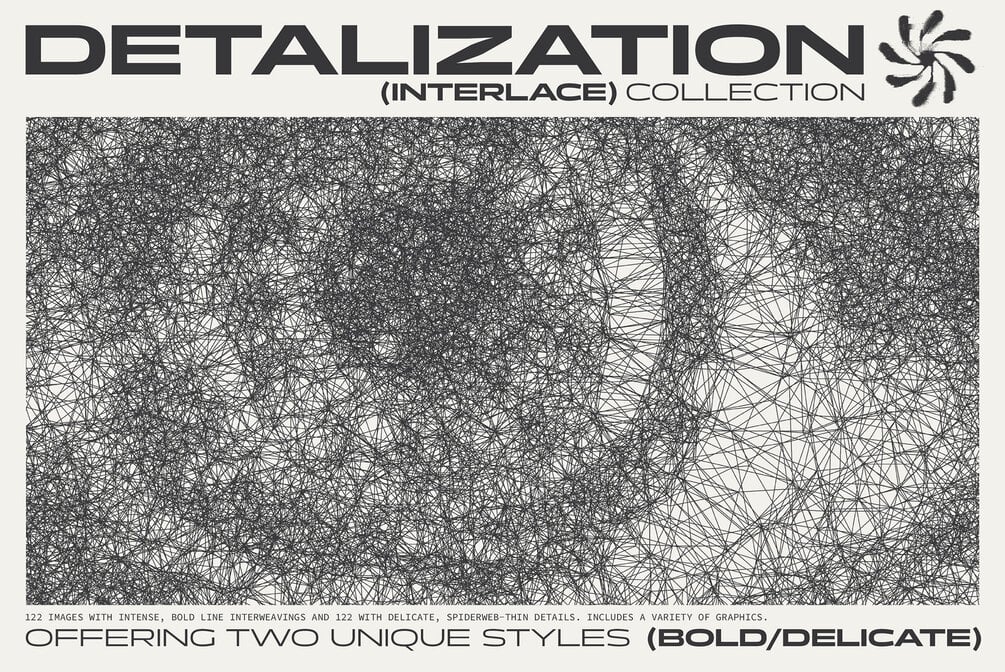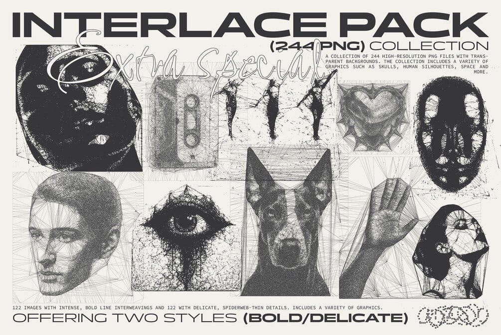 "Interlace" is a collection of 244 high-resolution PNG files with transparent backgrounds, offering two unique styles: 122 images with intense, bold line interweavings and 122 with delicate, spiderweb-thin details. The collection includes a variety of graphics such as faces, skulls, human silhouettes, space elements, robots, surreal visuals, animals, and more—perfect for enhancing modern youth-focused projects, posters, typography, and other creative applications. Created with AI assistance and extensive manual work.