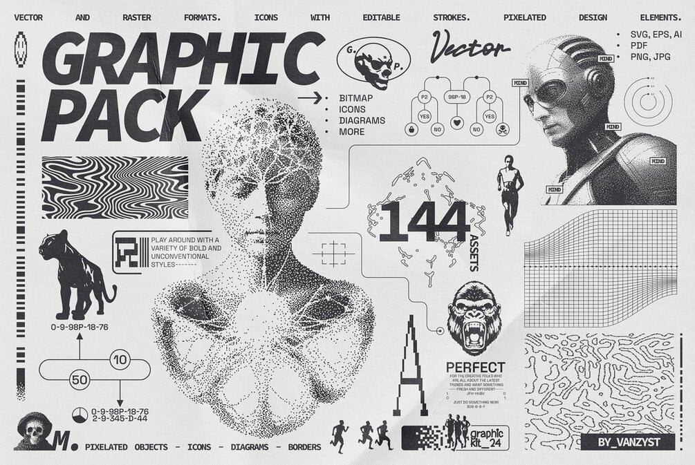 Here are ✦ 144 unique graphic assets ✦ including 48 pixelated objects (here you will find illustrations of an Astronaut, Comet, Street video surveillance camera, Moon, Skull, Car on Fire, Monkey, Crown, Panther Brain, Artificial Intelligence, UFO, Monsters, aliens, and other characters), 24 maximalist icons and mura patterns, 24 hud icons and frames, and 48 additional graphic elements. With this huge kit, you may create posters, t-shirt designs, music album designs, and everything you want. Use high-detailed shapes as the main object of your design, and low-detailed elements as an additional element.
