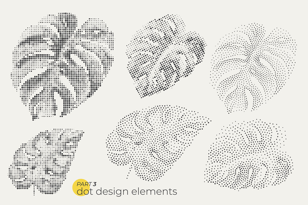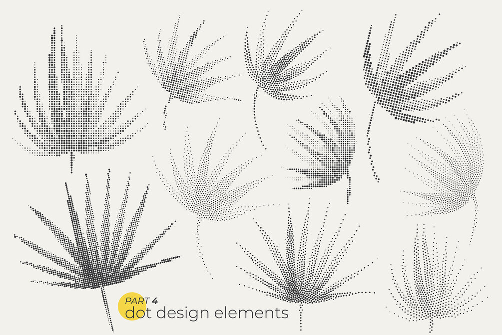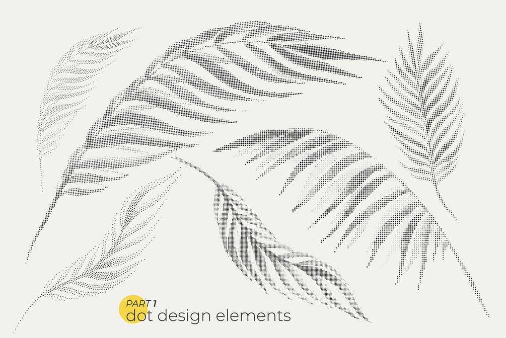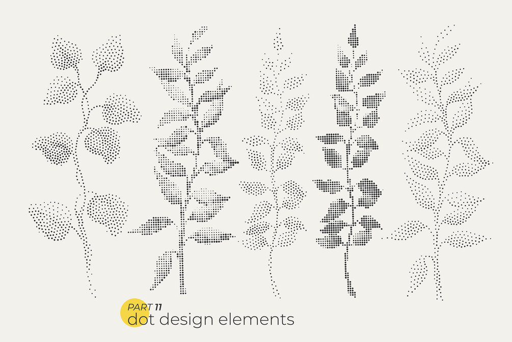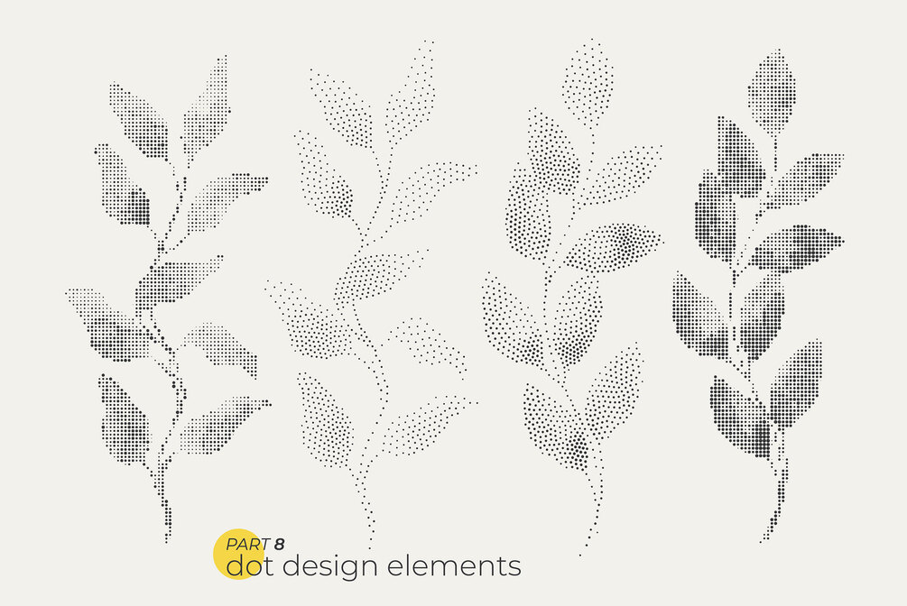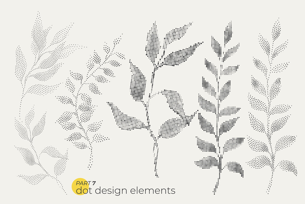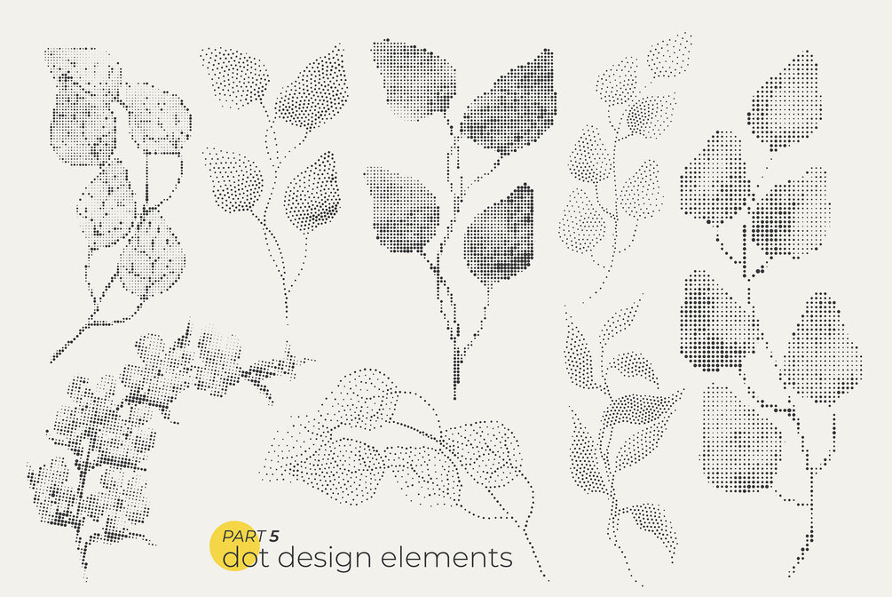 Unique modern collection of 74 dotty leaves, and floral elements for your design. Dotted bright bold plant elements in pointillism style.