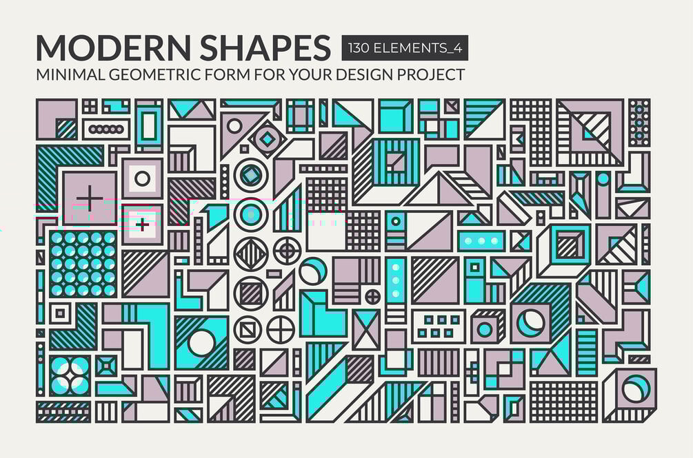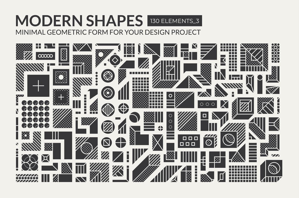 This huge set of minimal geometric shapes includes 130 design elements in 5 different styles. All elements are easily editable and change thickness, color, etc. Universal vector geometric shapes from the set are suitable for animation, logo design, business cards, brand books, photography, posters, postcards, stickers, banners, web, social media, magazines, leaflets, billboards, patterns, etc.