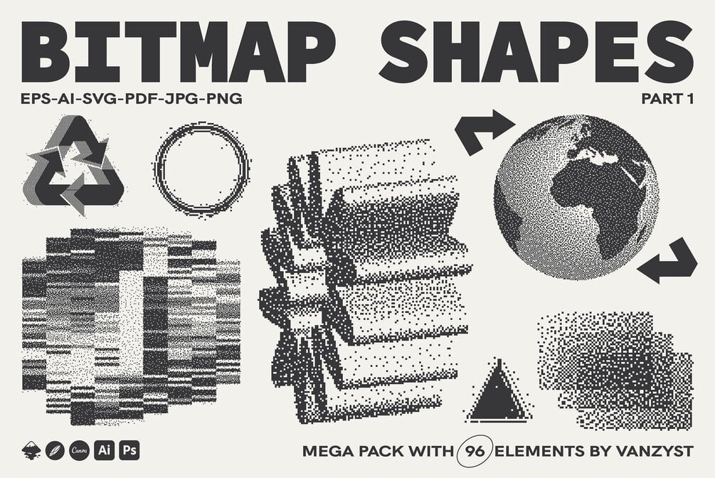 Collection "Bitmap Vector Shapes. Part 1" is a big set of high-quality 96 Abstract Universal Vector Objects based on popular graphic elements such as wireframe planet, arrows, vortex, star, geometric freeforms, smile, and other modern acid abstract shapes. There are basic smooth flat elements and unique textured objects with a perfect vector bitmap effect that imitates pixels like the Dither effect in a raster image.
