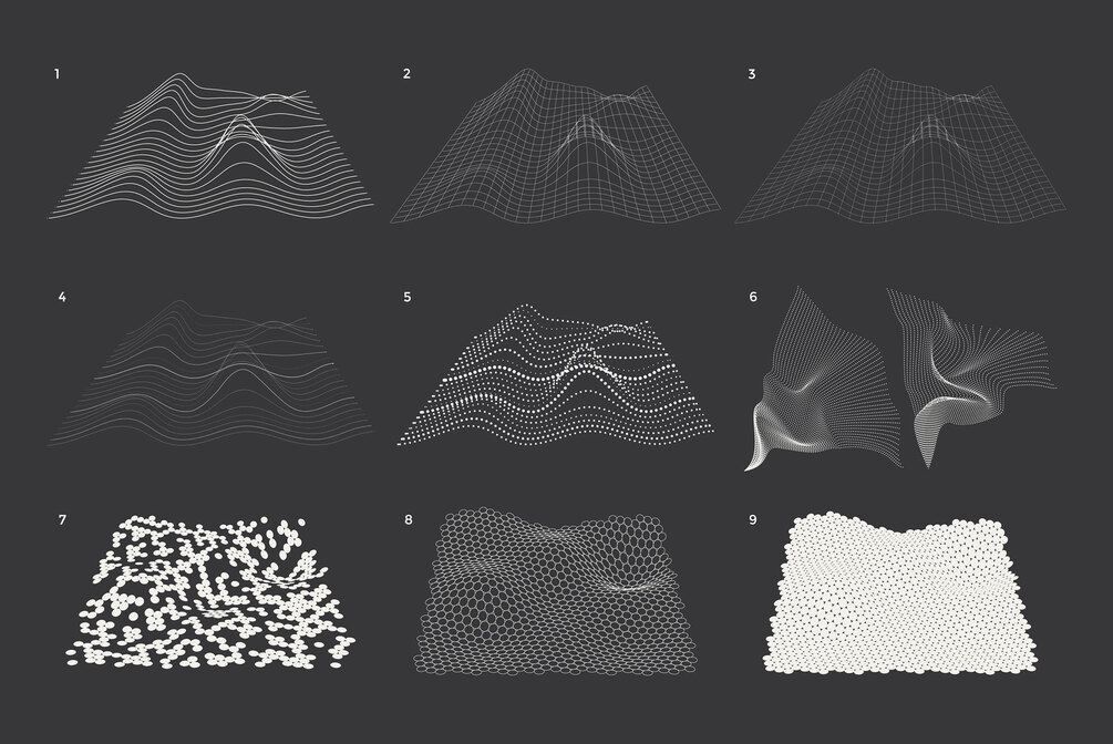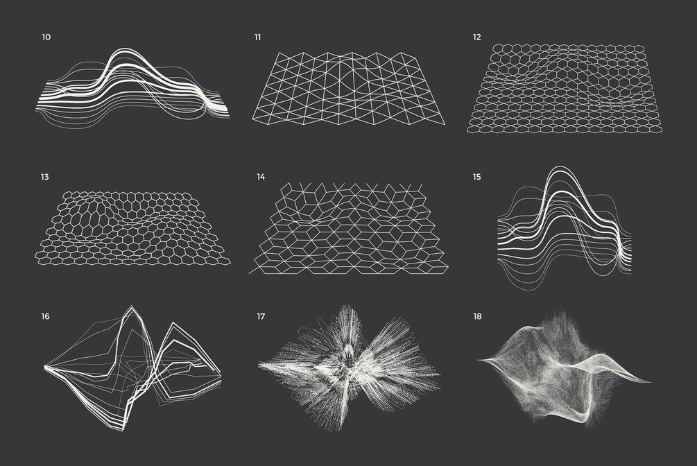 Technological shapes from this project will give your design recognition and uniqueness. You may use forms for app interfaces, posters, postcards, patterns, logo design, business cards, brand books, animation, web, clothes, photography, etc.