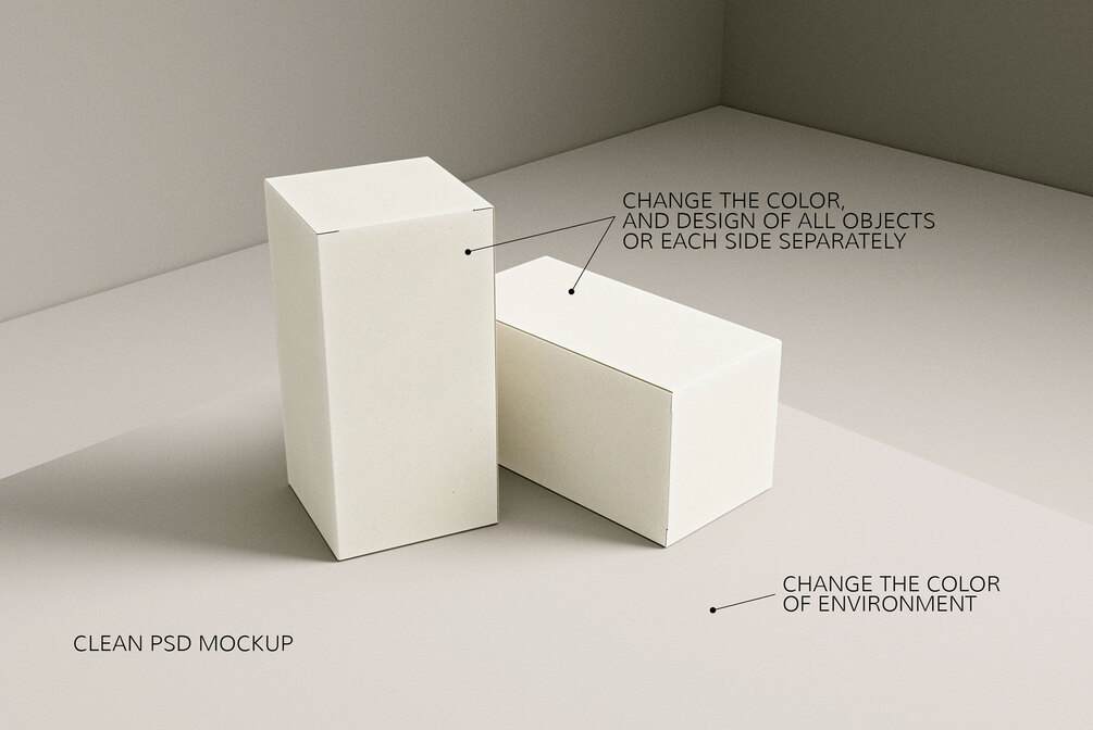 Easy to edit, fully customized High-Quality 2 Cosmetic Boxes PSD Mockup for Photoshop. Change the design and color of the whole boxes, or each side separately, and the background. Place your design on all sides, and do everything you need in one click.